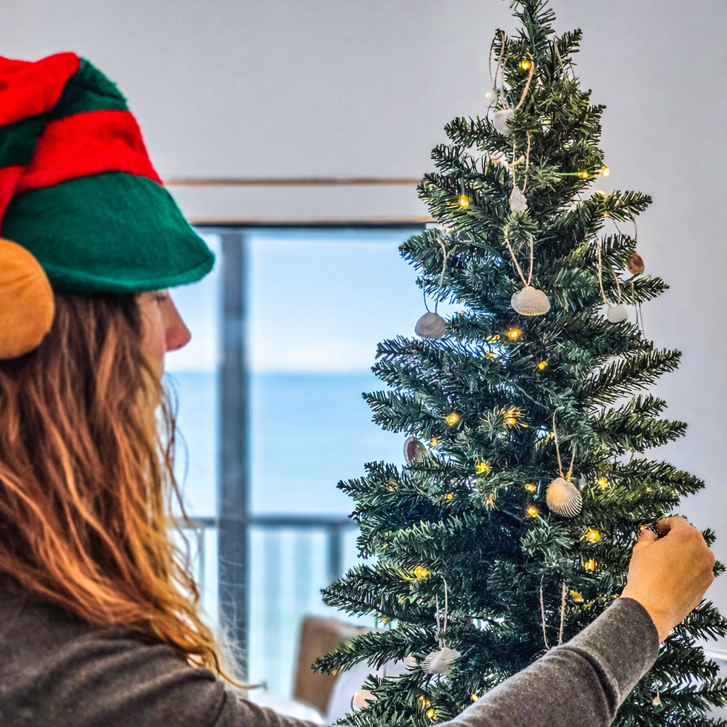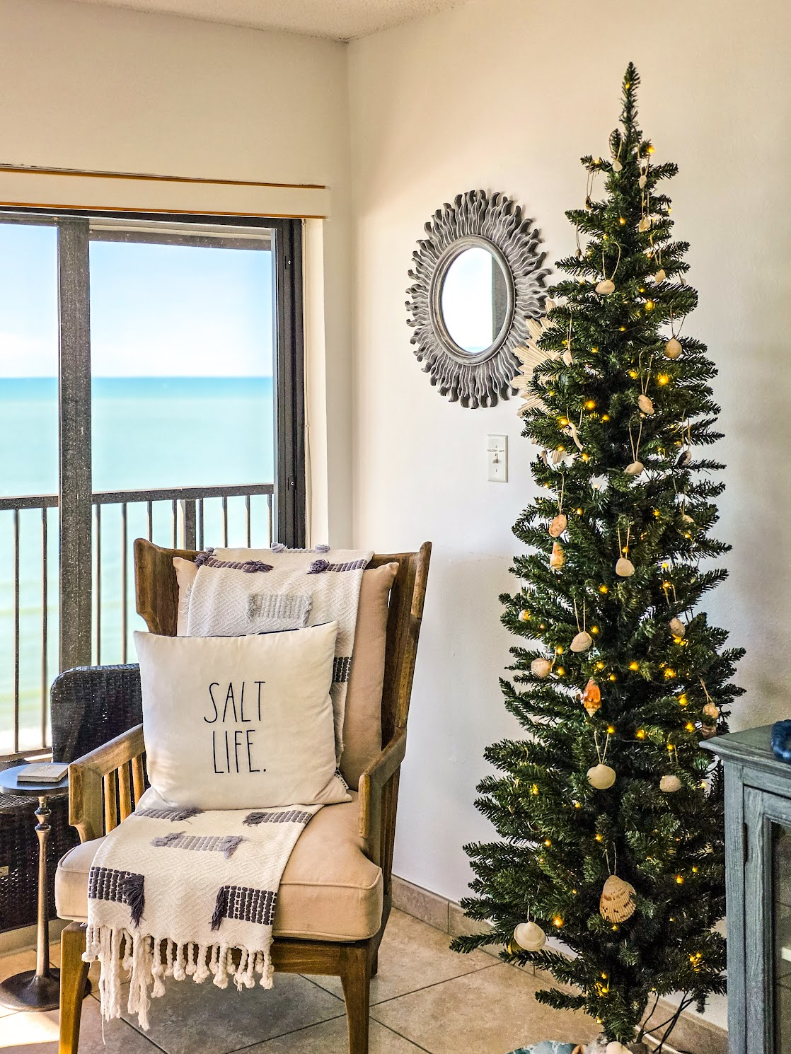 For Christmas, our condo Christmas tree gets a coastal makeover, decorated with seashells instead of traditional ornaments. It’s a small but meaningful way we blend classic holiday traditions with the place we love most: right here by the sea.