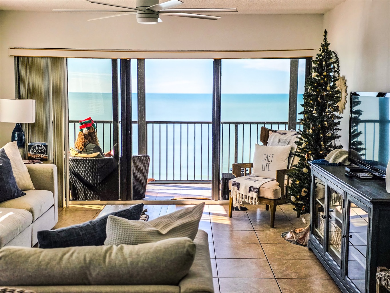 When you’re celebrating the holidays with the Gulf just beyond the balcony, it only makes sense to let the surroundings shape the décor. Our seashell Christmas tree doesn’t try to imitate a snowy postcard. Instead, it reflects coastal living—soft lights, natural textures, and the calming presence of the ocean outside the window.